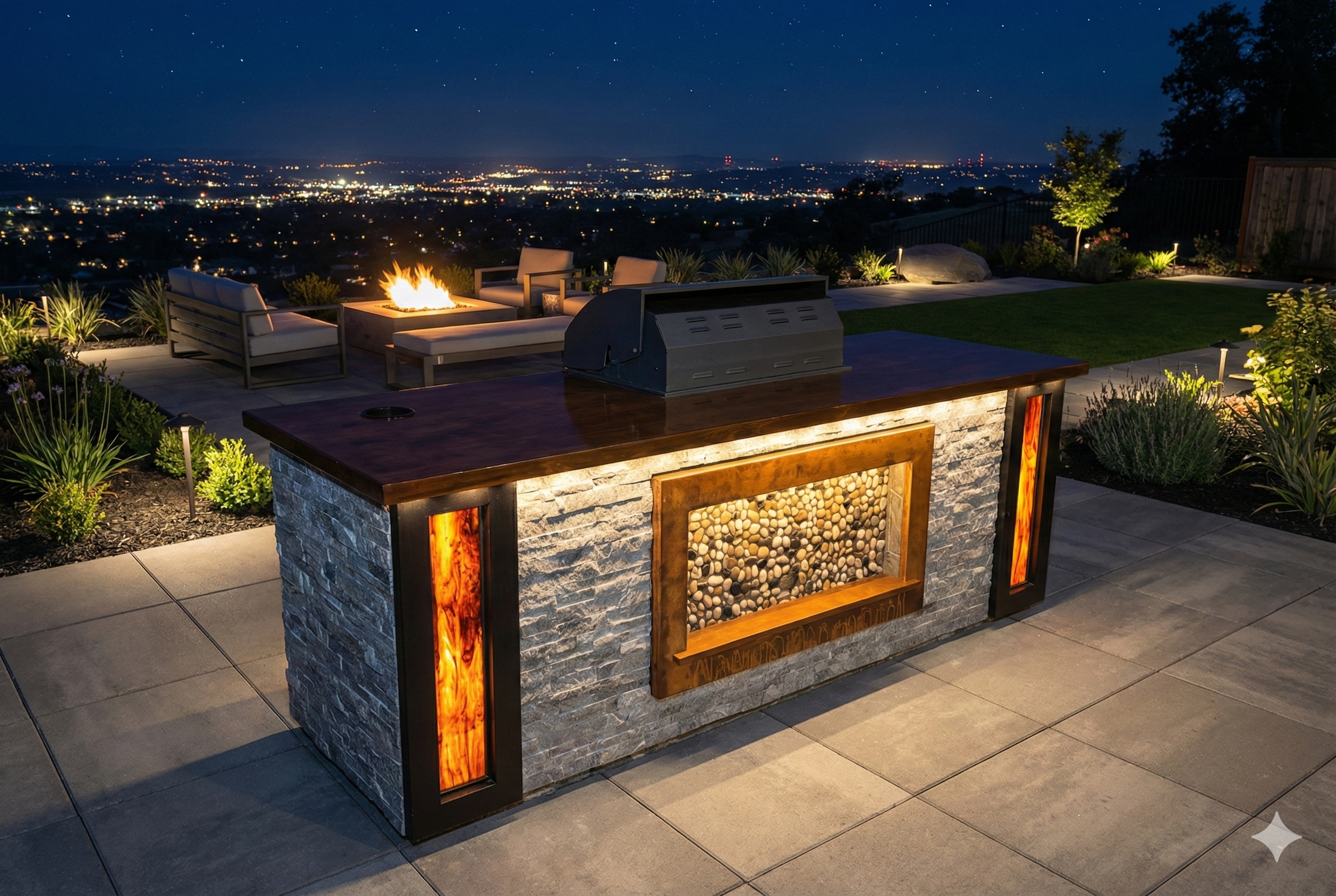 At the center, it features a polished pebble waterfall, beautifully accented by a precast surround and sill. We’ve enhanced the piece with one of our signature rust patinas for added character.