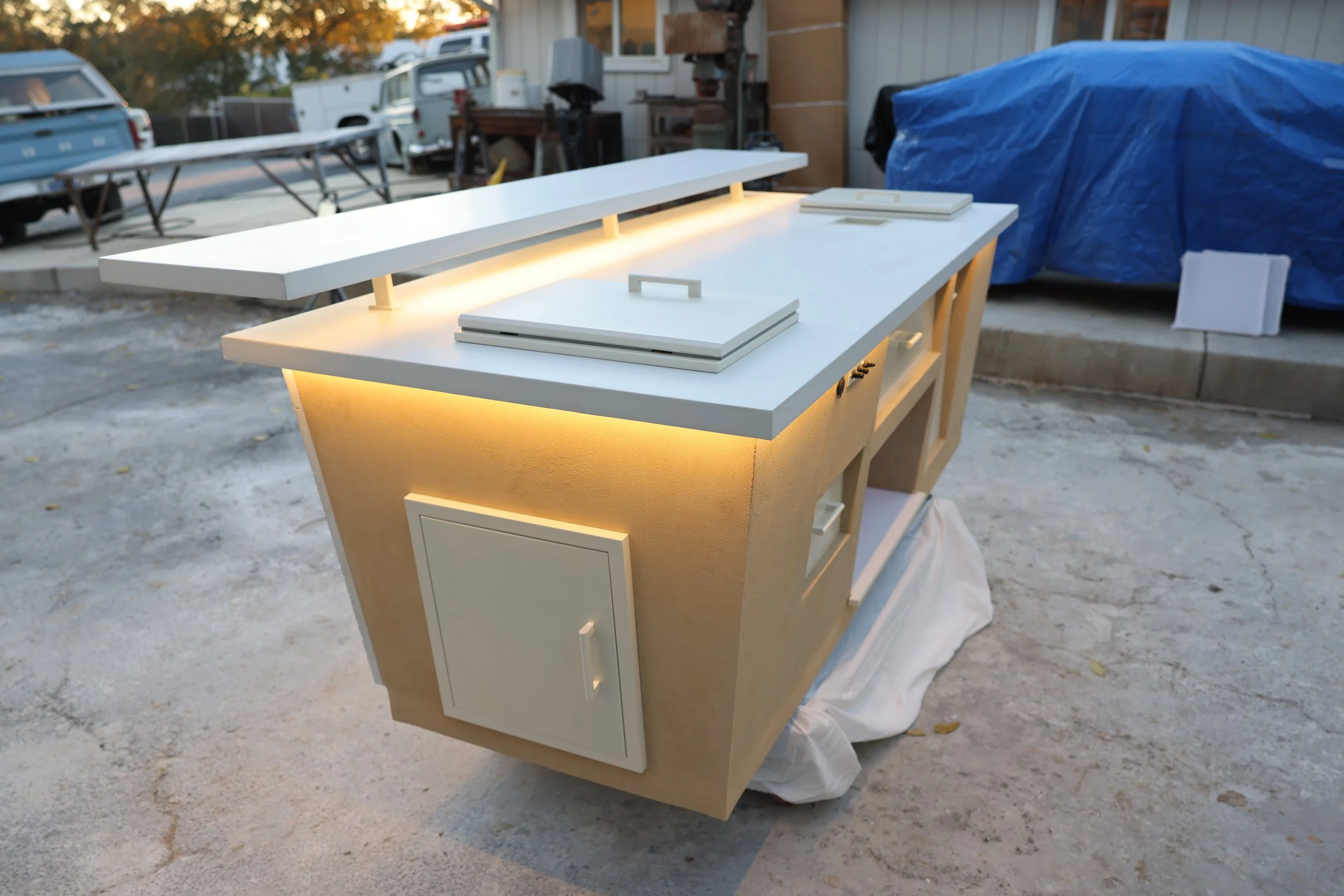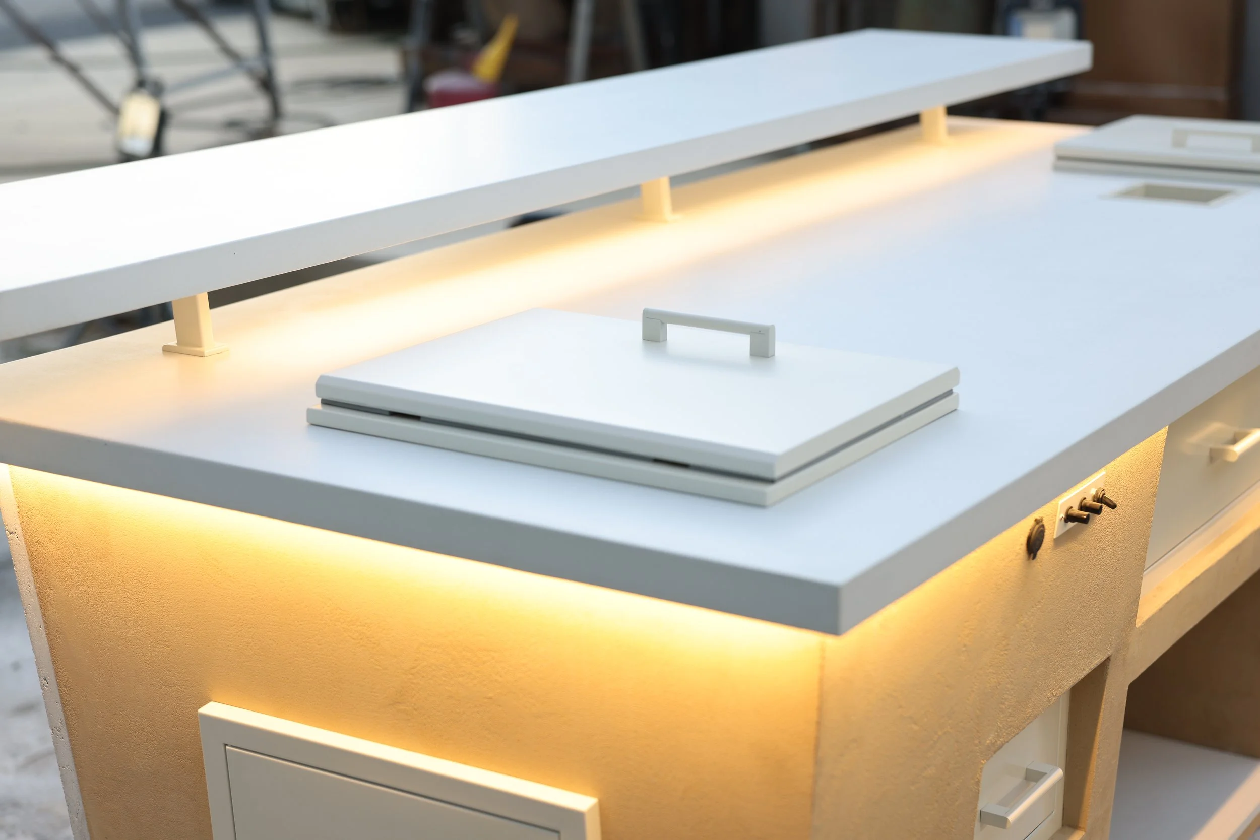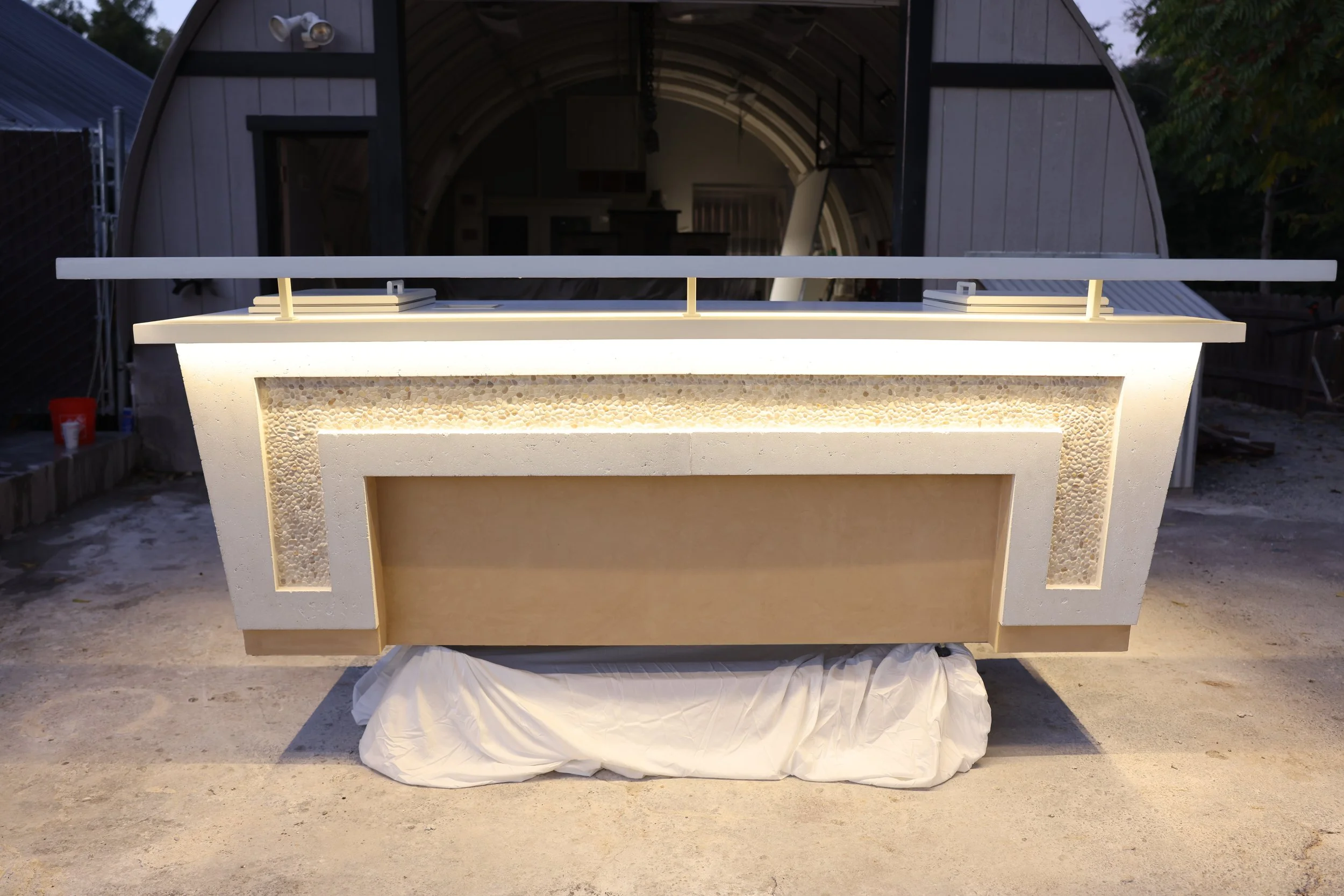The counter and bar tops are stunning. For this piece, we selected a milky-white GFRC mix design. The counters are fitted with LED lighting, casting light downward onto the structure and the ground. The service counter includes two large coolers on each side, leaving ample prep space in the middle.