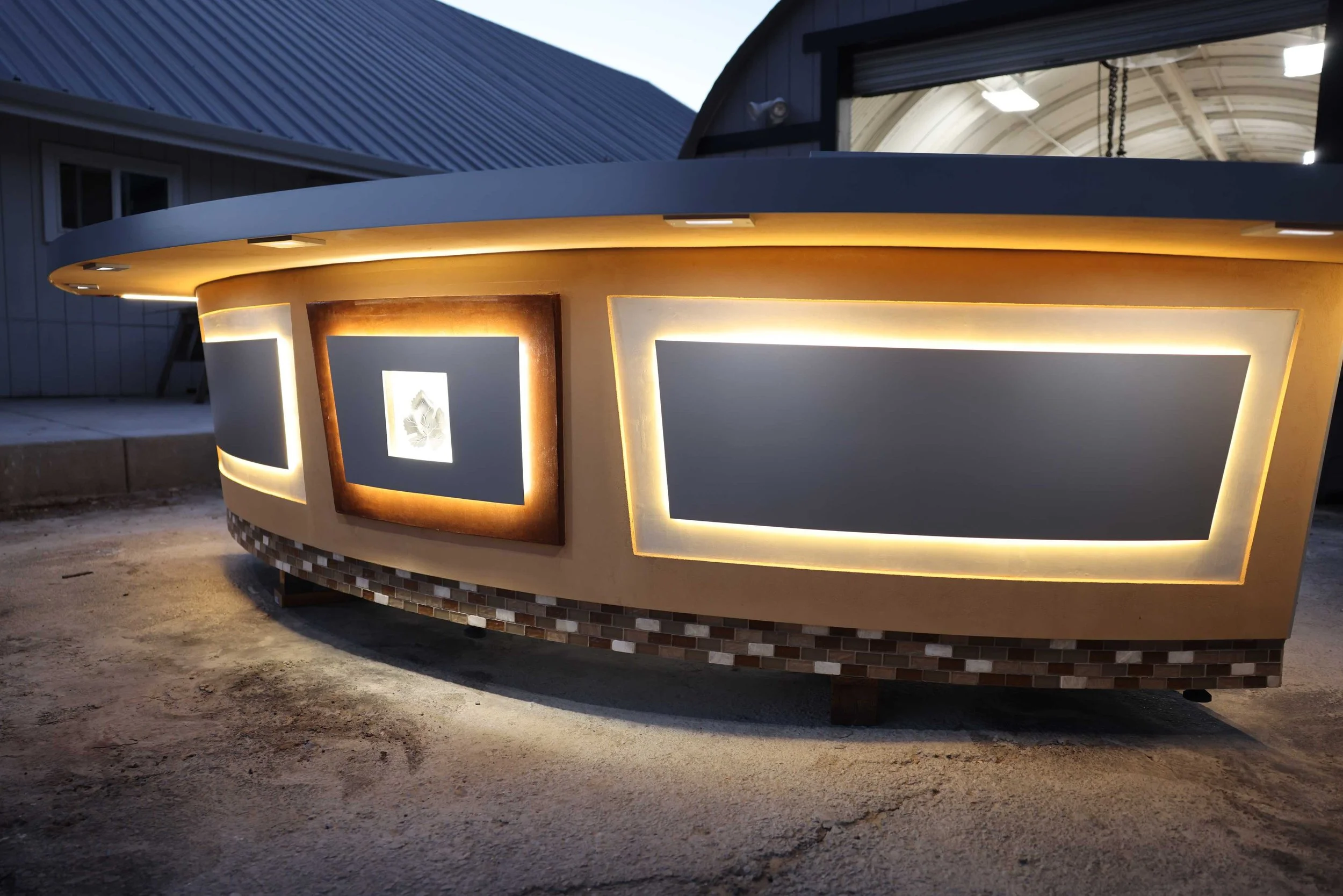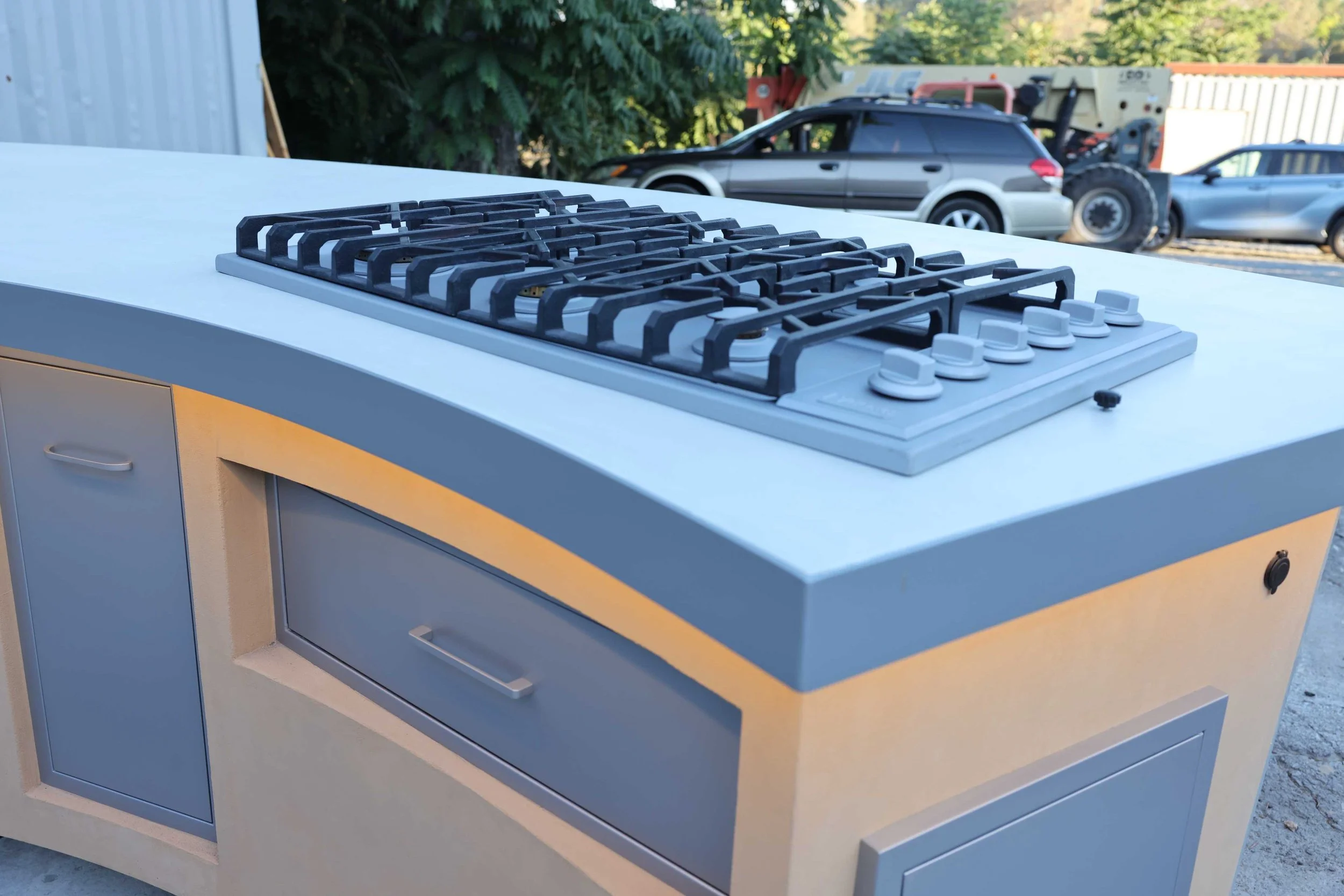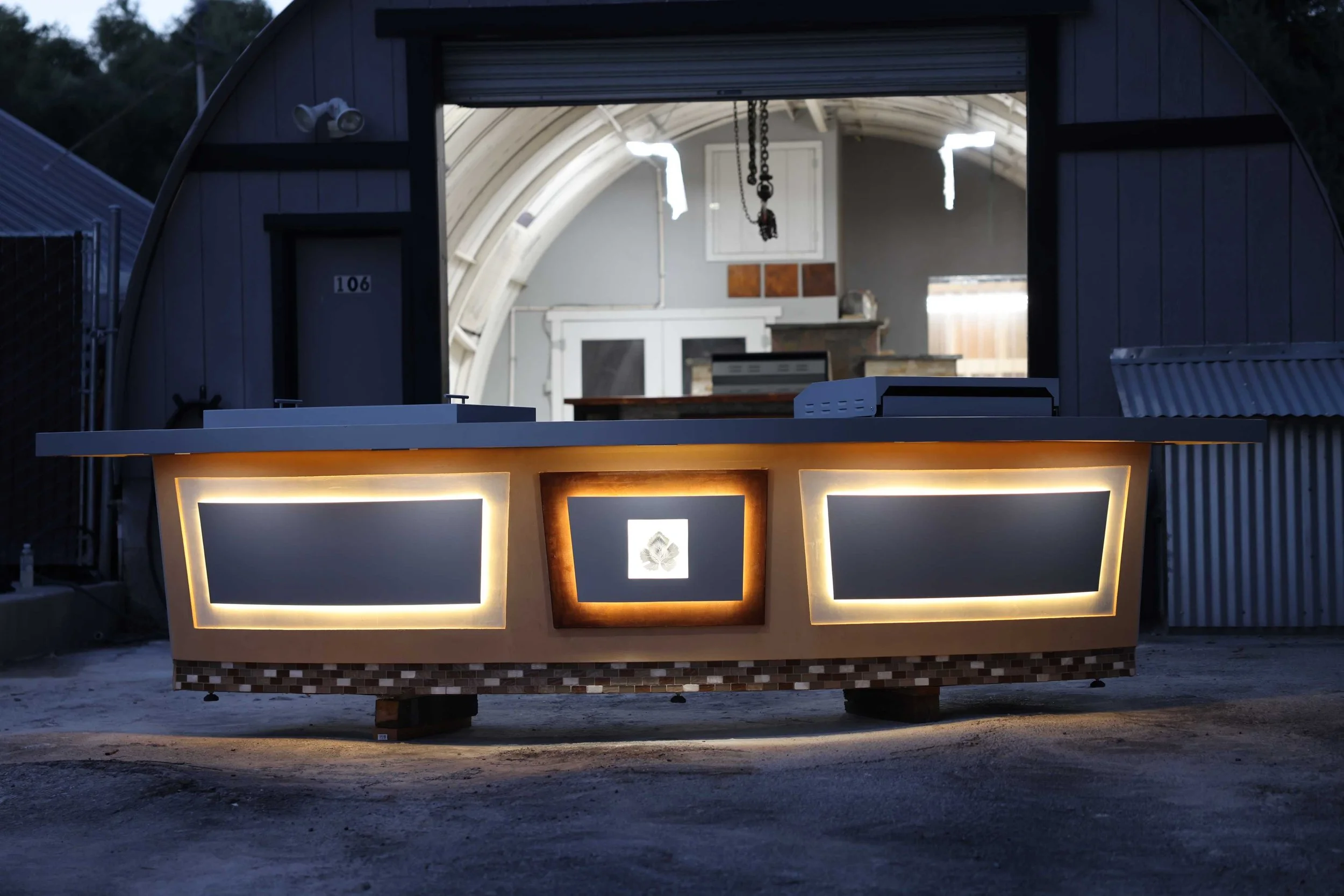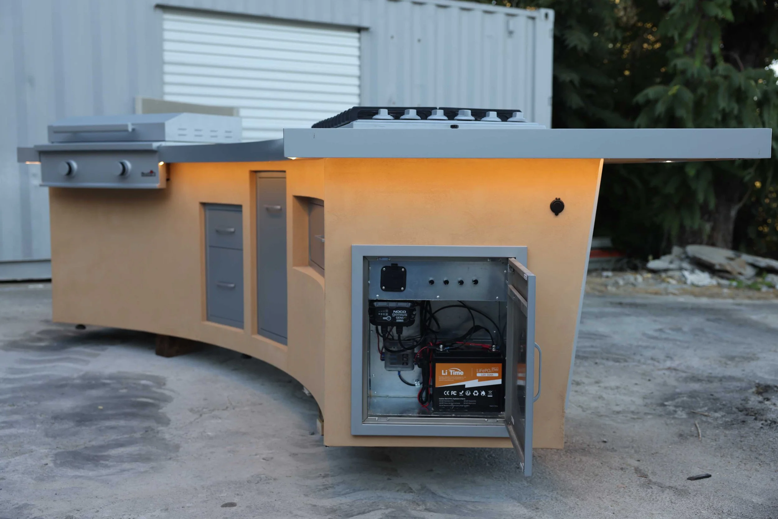 We have created depth and contrast using recessed elements, opposing angles, well-designed mediums then adorned with creative lighting. The countertop is finished with a white burnished concrete micro topping, then edged with silver metallic aluminum bar. All fixtures have been painted metallic silver, then clear coated. Our cooking elements receive a high temperature ceramic coating available in numerous colors. The SILVER LEAF is fitted with our rechargeable 12V battery system and onboard USB port.