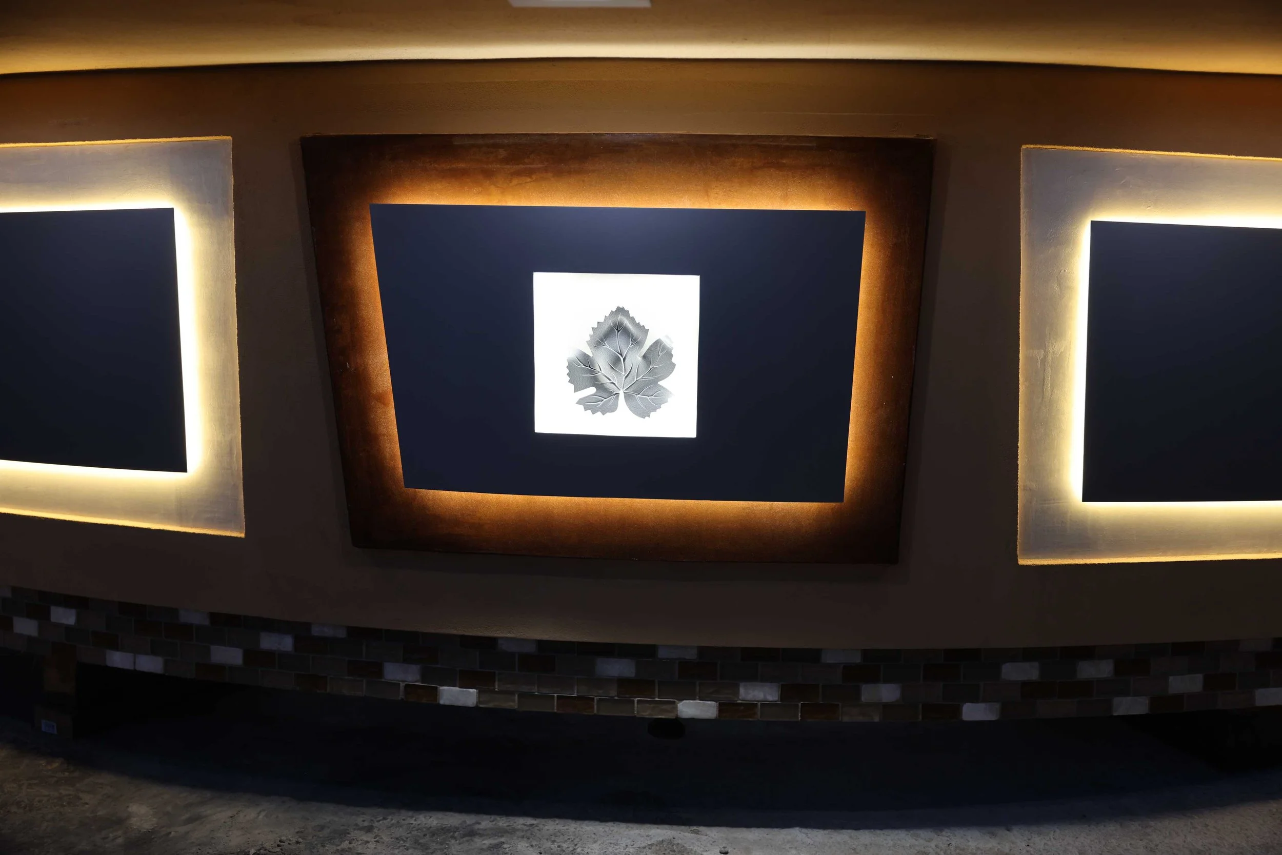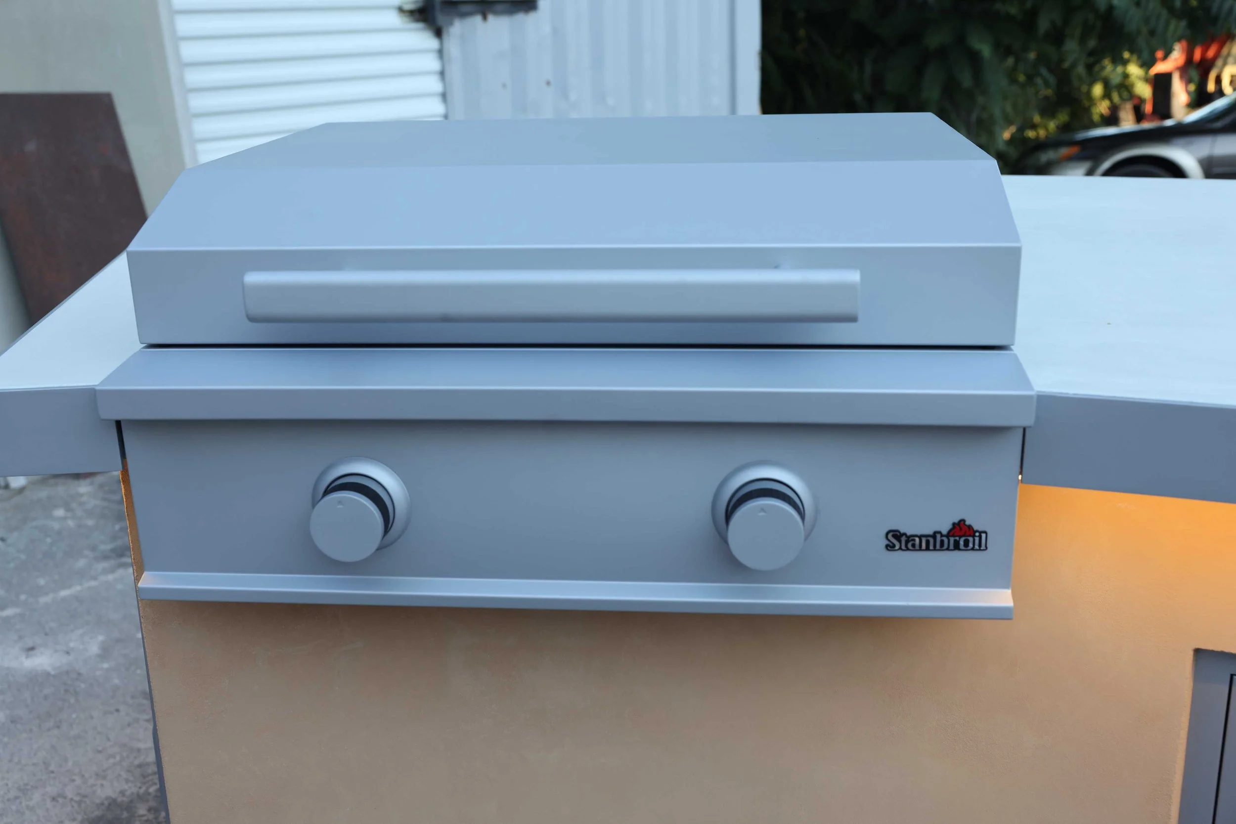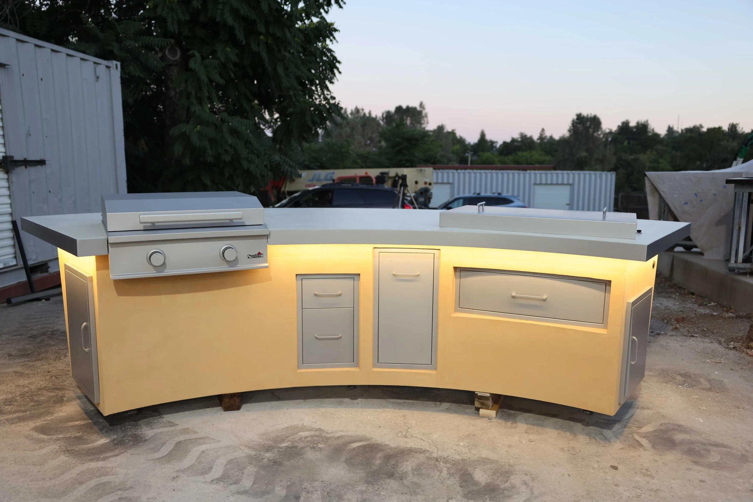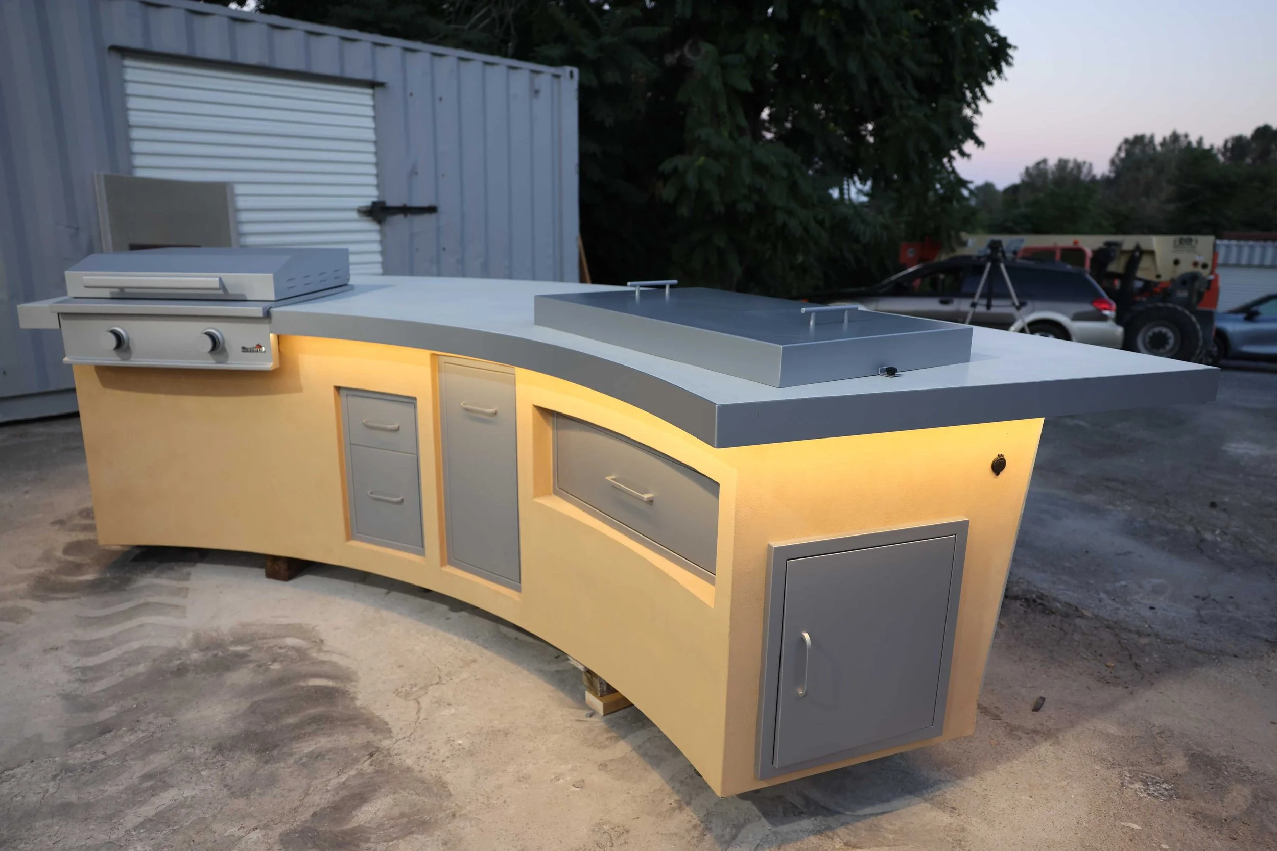 We have created depth and contrast using recessed elements, opposing angles, well-designed mediums then adorned with creative lighting. The countertop is finished with a white burnished concrete micro topping, then edged with silver metallic aluminum bar. All fixtures have been painted metallic silver, then clear coated. Our cooking elements receive a high temperature ceramic coating available in numerous colors. The SILVER LEAF is fitted with our rechargeable 12V battery system and onboard USB port.
